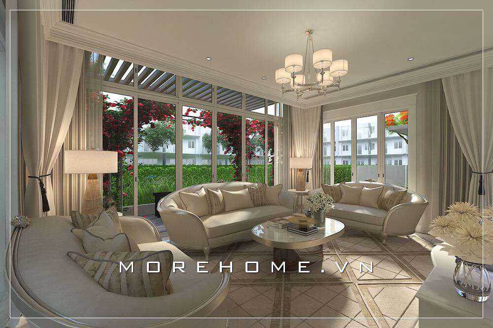 Bộ sofa phòng khách khung gỗ tự nhiên cao cấp, kiểu dáng tân cổ điển sang trọng bọc vải màu kem mang đến không gian đẳng cấp cho nhà biệt thự
