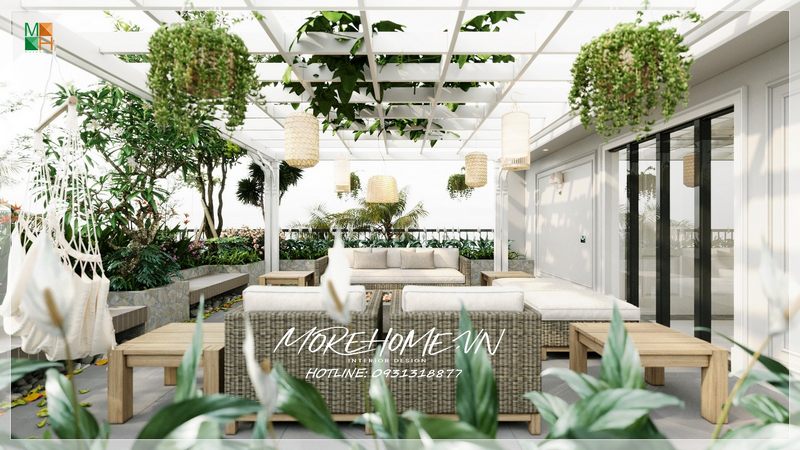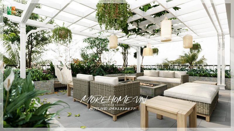 Vẻ đẹp sân thượng nhờ một phần vào trồng cây xanh, sự xuất hiện của cây xanh tiểu cảnh hay được trồng trực tiếp dưới đất tạo cho không gian sân thượng xanh mát mẻ dễ chịu về bầu không khí