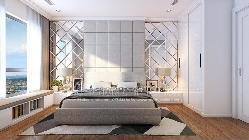 Trang trí nội thất phòng ngủ bố mẹ với mẫu giường ngủ gỗ công nghiệp bọc vải màu xám đầy quyến rũ