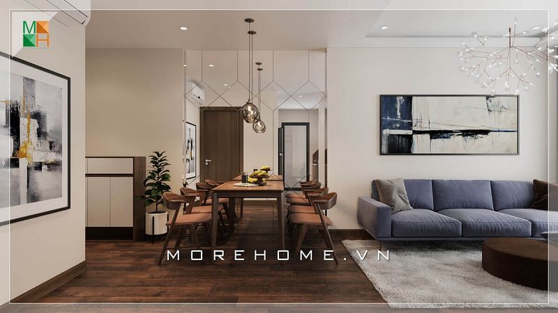 Mẫu thiết kế phòng ăn liền phòng khách, với bộ bàn ăn sử dụng gỗ tự nhiên phong cách hiện đại tối giản, kết hợp cùng ghế sofa văng bọc nỉ, mang lại không gian sinh hoạt trẻ trung hiện đại cho gia chủ